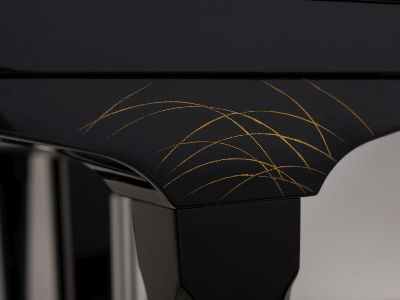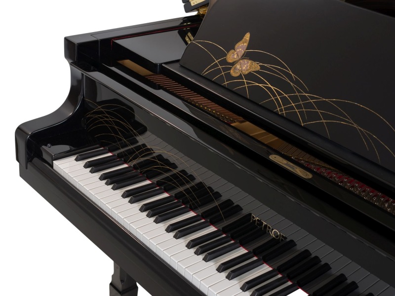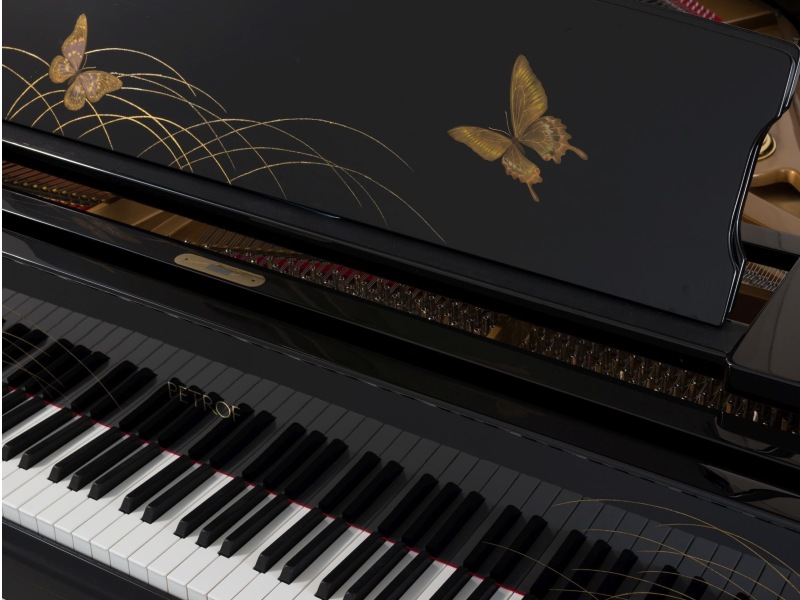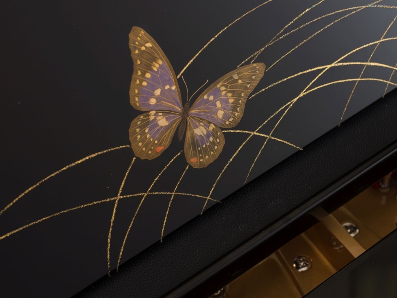 با استفاده از تکنیک سنتی ژاپنی maki-e، پیانو با موتیف‌های پروانه تزیین شده است.